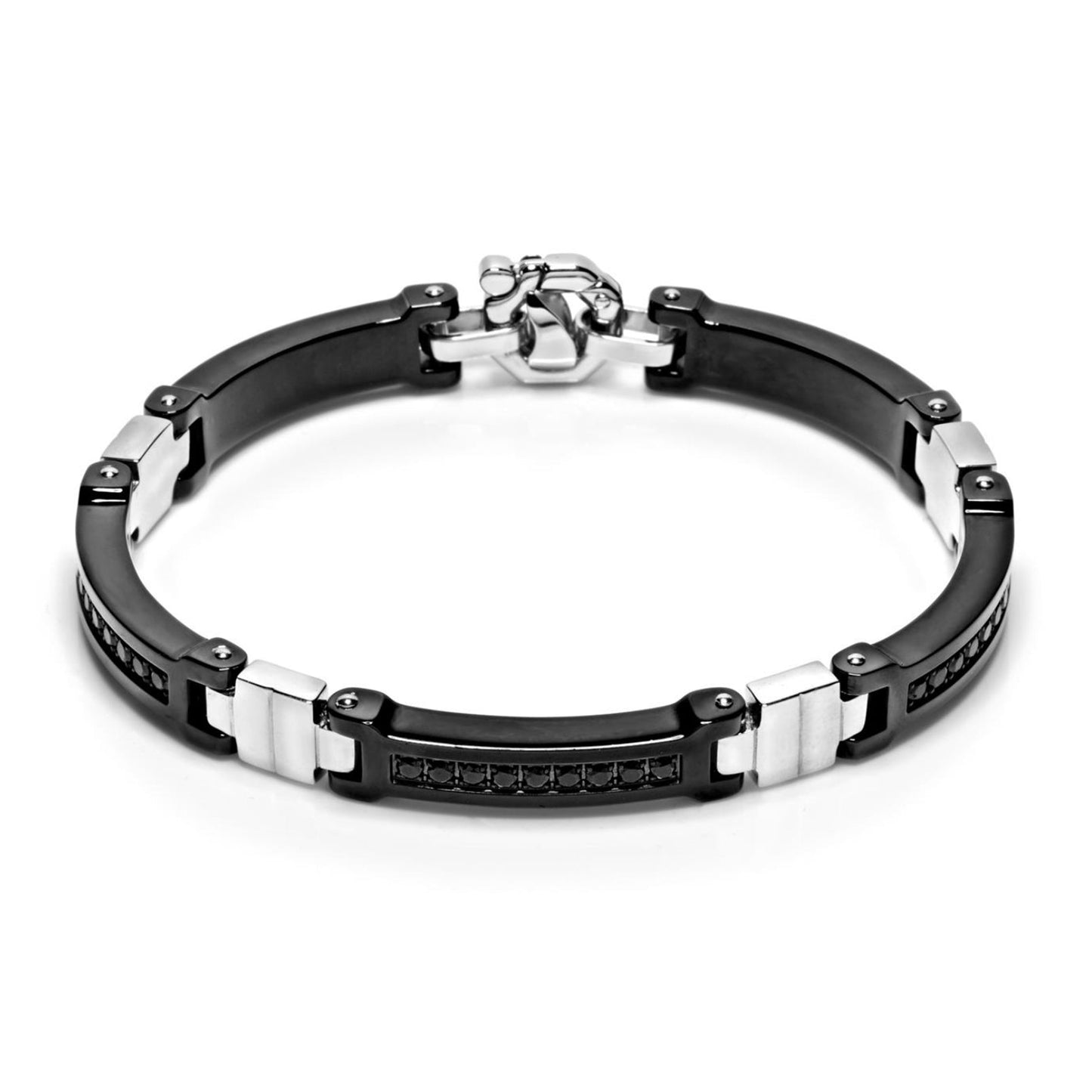 Stainless steel bracelet with black PVD, white gold and black diamonds. White diamond in the clasp.