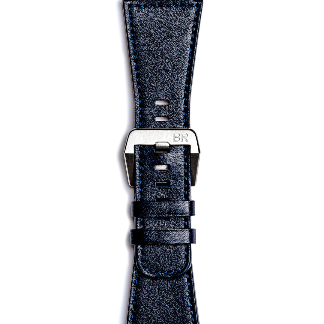 Watches in steel with blue leather(calfskin) strap and sapphire glass.