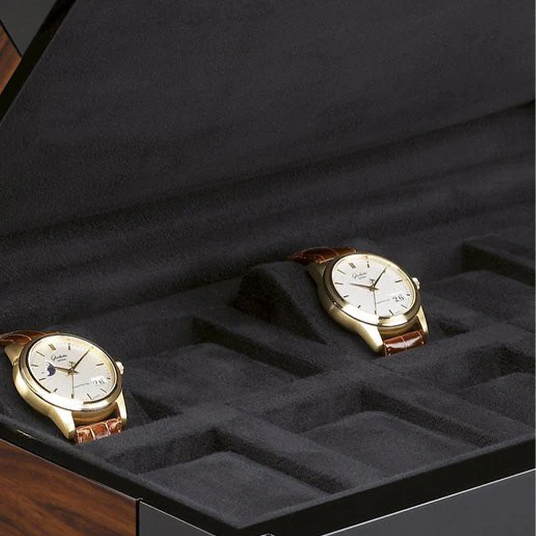 - Hand finished case with 10 layers of black lacquer