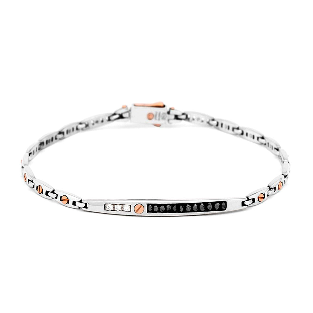 White gold bracelet with white and black diamonds. The bracelet features white gold mechanical links with rose gold details and central tag embellished by expertly set white and black diamonds.
