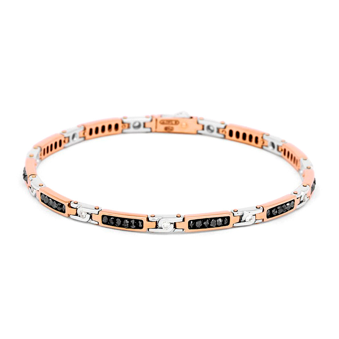 Rose gold bracelet with white and black diamonds. The bracelet features white gold mechanical links with rose gold details and central tag embellished by expertly set white and black diamonds.