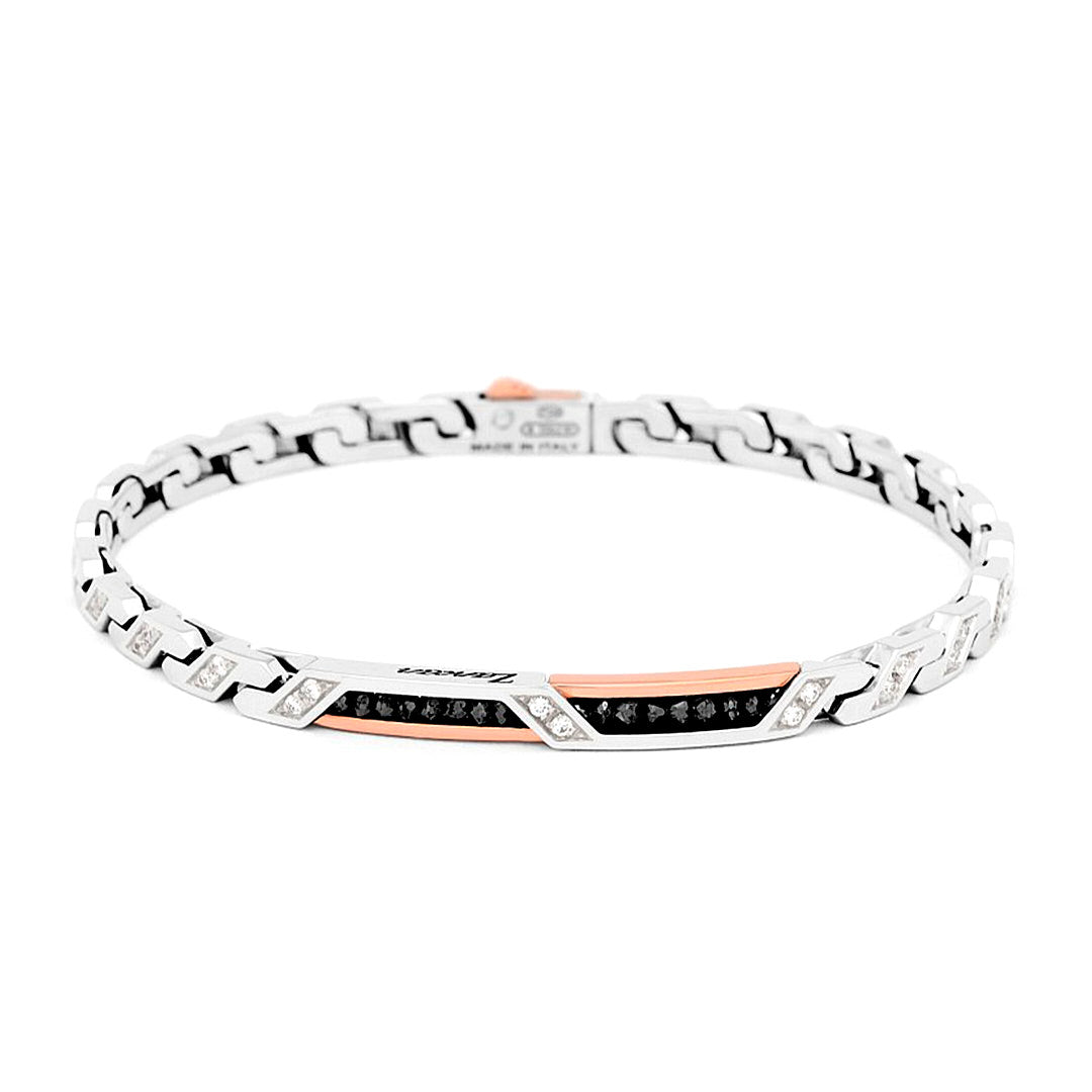 White gold bracelet with white and black diamonds. The bracelet features mechanical links alternating with white diamonds. The central tag with rose gold details is embellished by expertly set black diamonds.