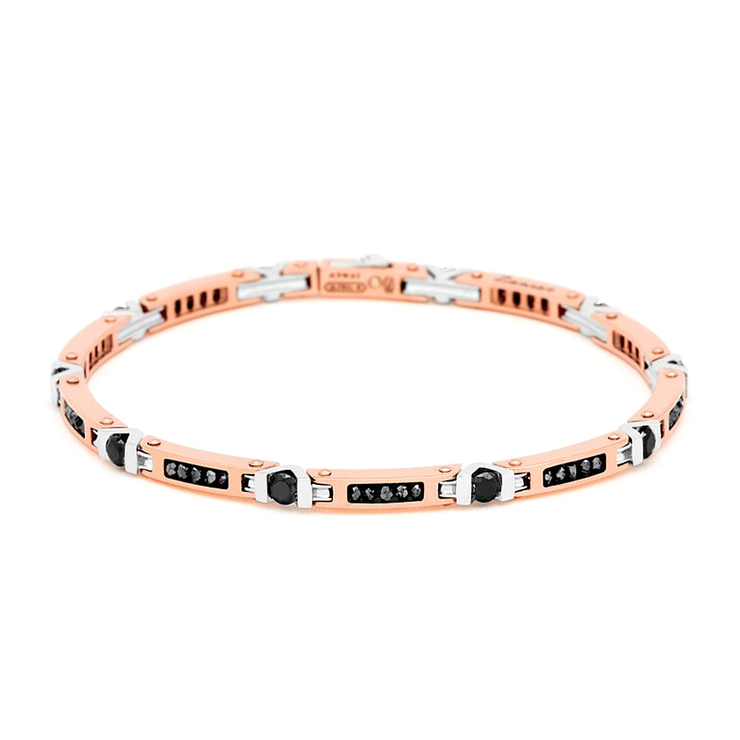 Rose gold bracelet with black diamonds. The bracelet features alternating mechanical links embellished with black diamonds. Each link is separated by a white gold detail that contains a brilliant cut black diamond.