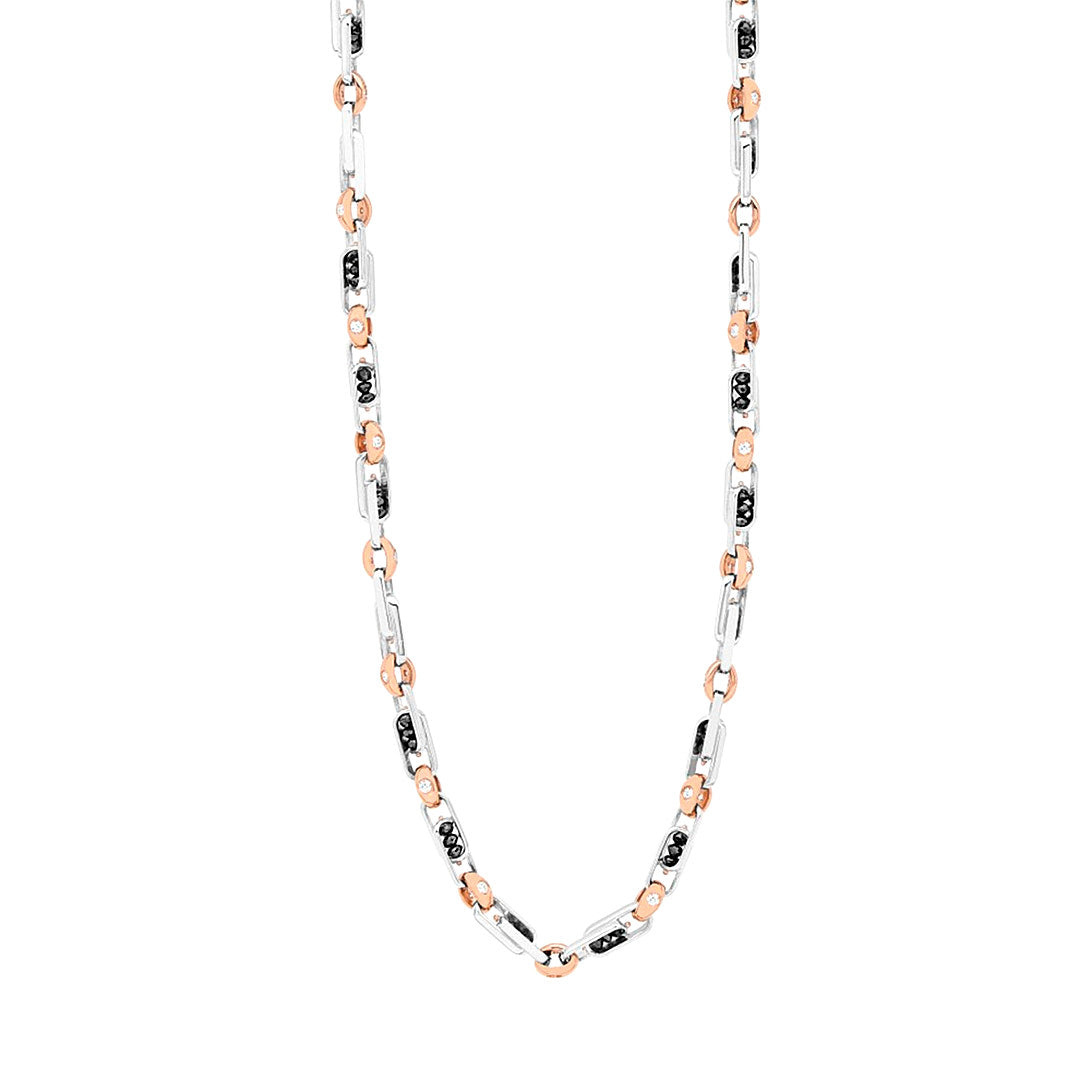 White and rose gold сhain with black and white diamonds. The necklace features mechanical links alternating with rose gold rings, each with a white diamond set into it and a series of black diamonds.