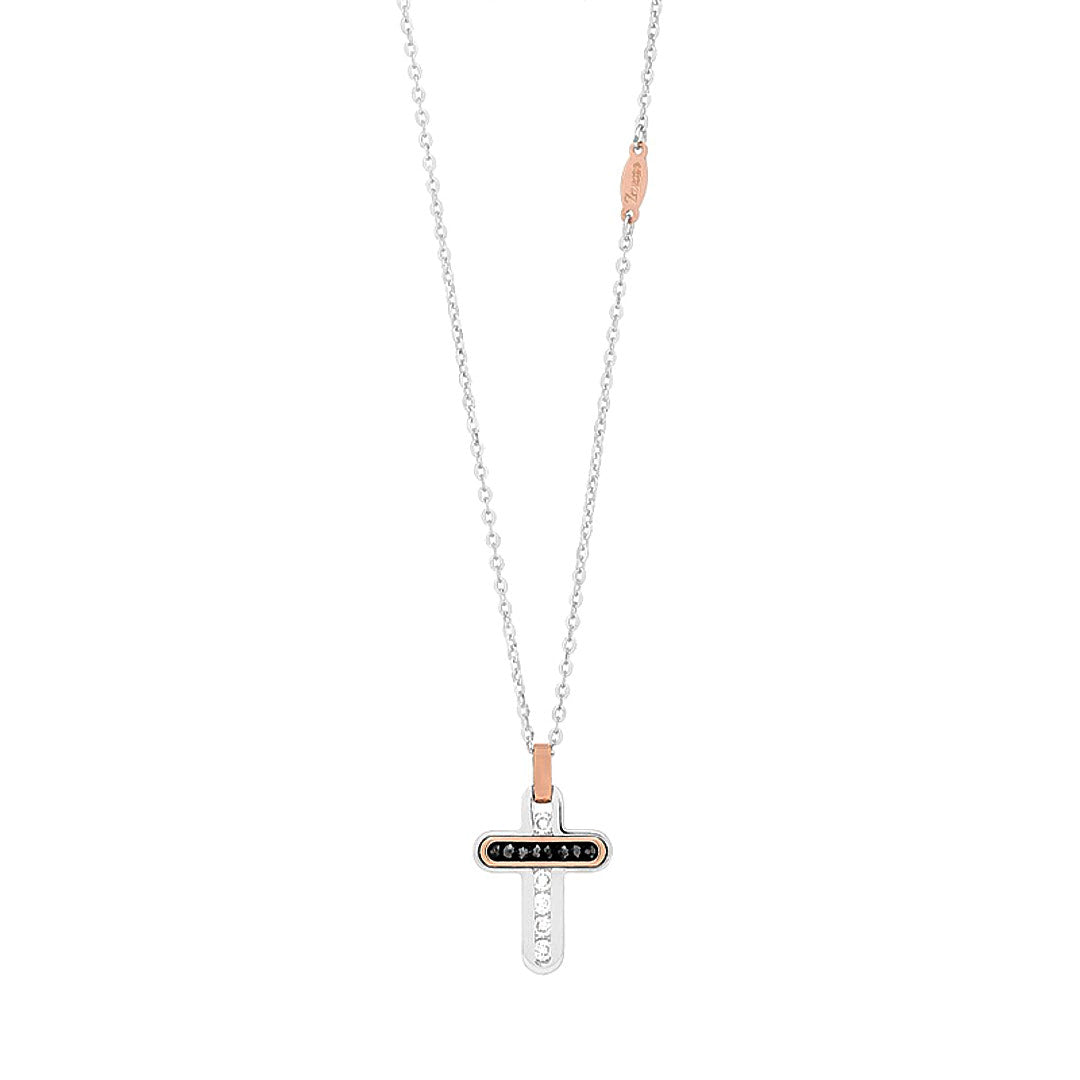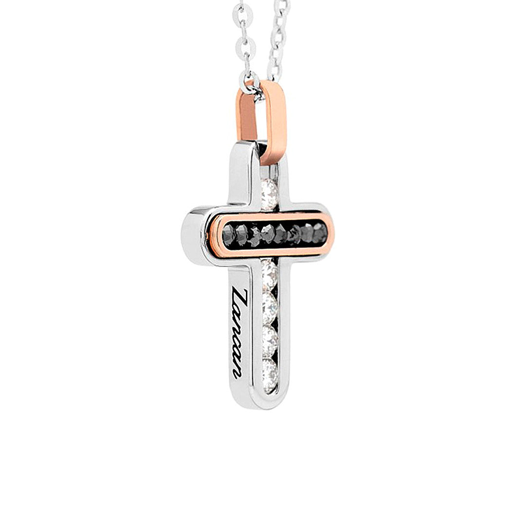 White and rose gold cross with white and black diamonds. The necklace features a cross with white and black diamonds enclosed in a design with subtle architectural references.