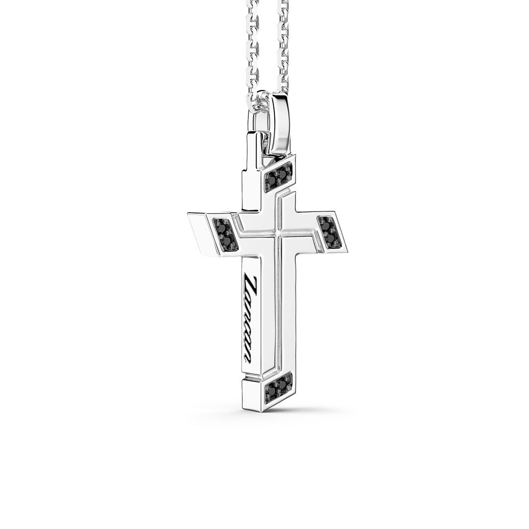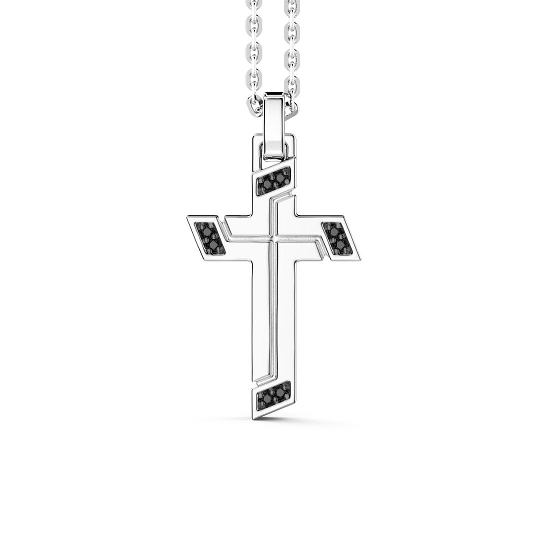 Silver cross with linear engravings that underscore rhombus-shaped openings into which black spinels have been set.