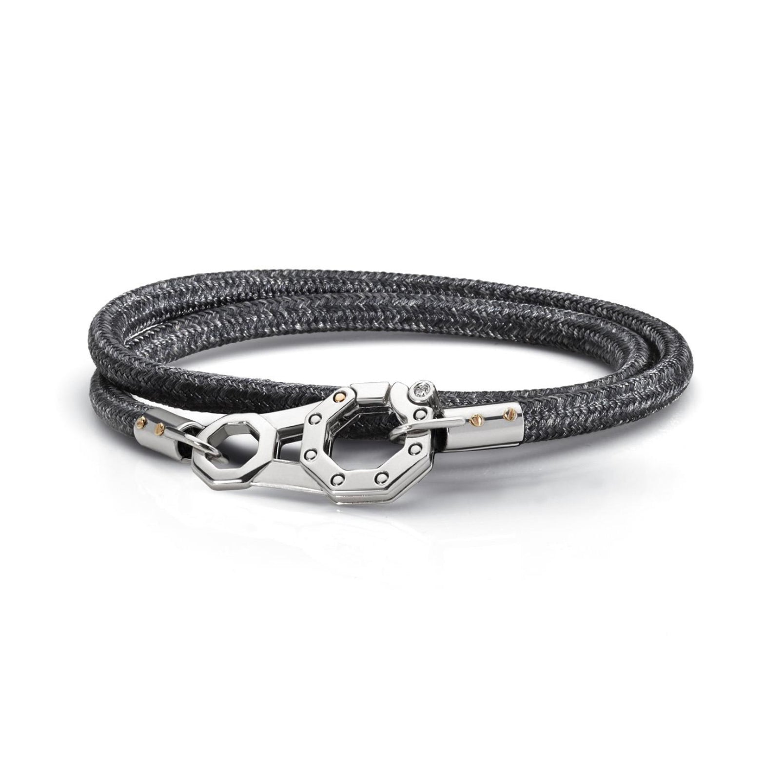 Gray synthetic rope bracelet with stainless steel and rose gold. White diamond in the clasp.