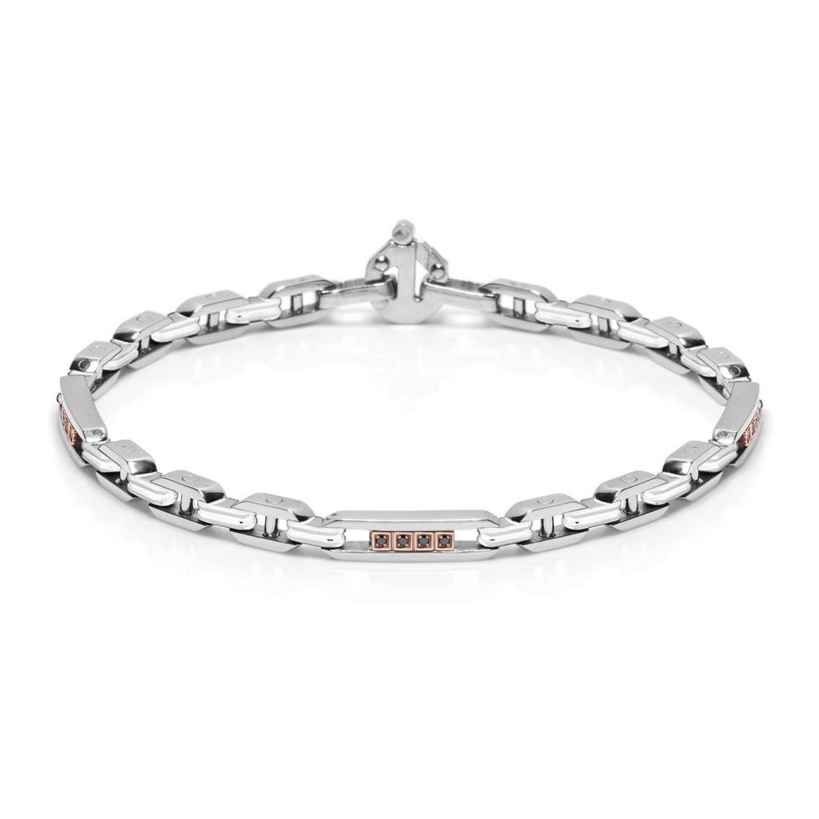 Stainless steel bracelet with white ceramic, rose gold and black diamonds. White diamond in the clasp.
