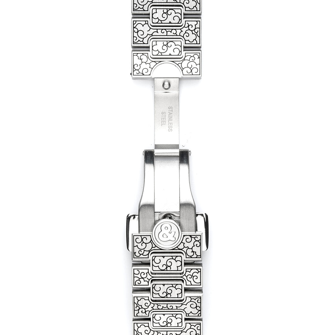 Watches in steel with laser-engraved steel strap and sapphire glass.
