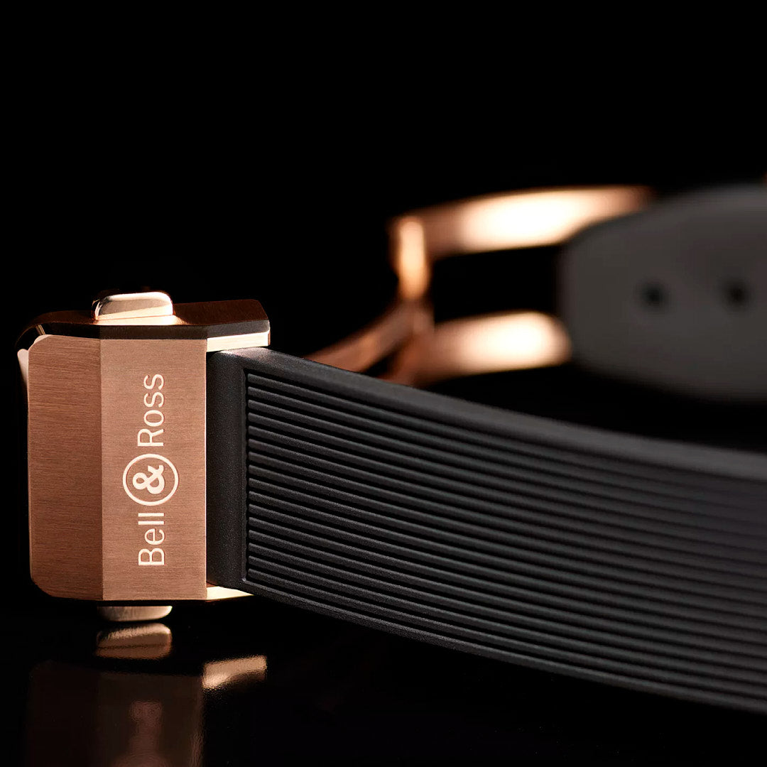 Watches in rose gold with black rubber strap and sapphire glass.