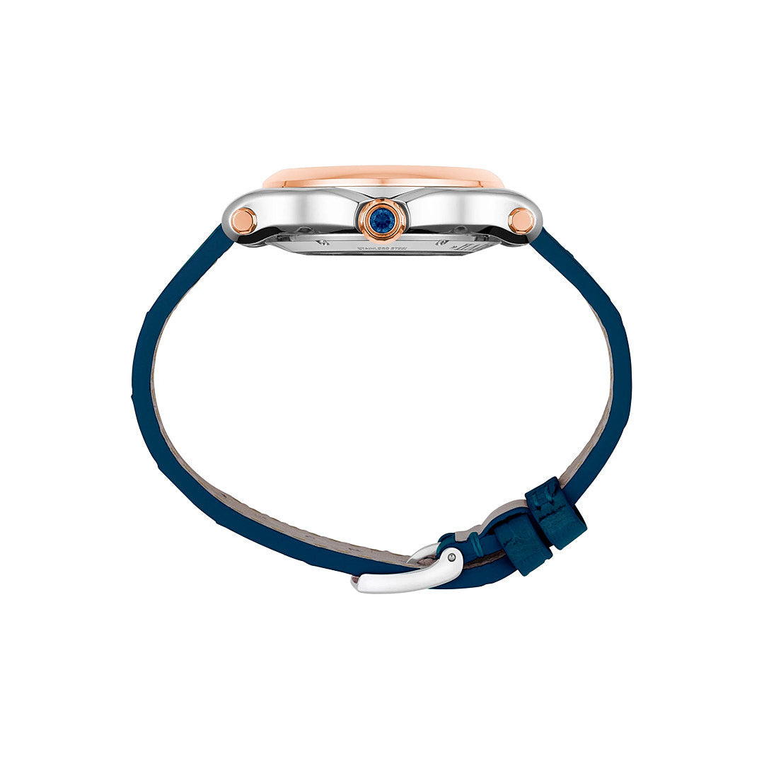 Watches in rose gold and stainless steel case with diamonds, sapphire glass and blue alligator leather strap.