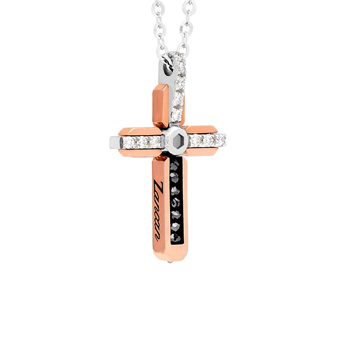 Rose and white gold cross with white and black diamonds. The necklace features a long-limbed cross with white and black diamonds supporting the design.